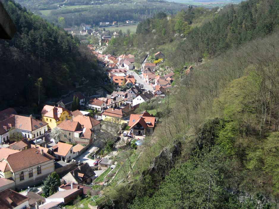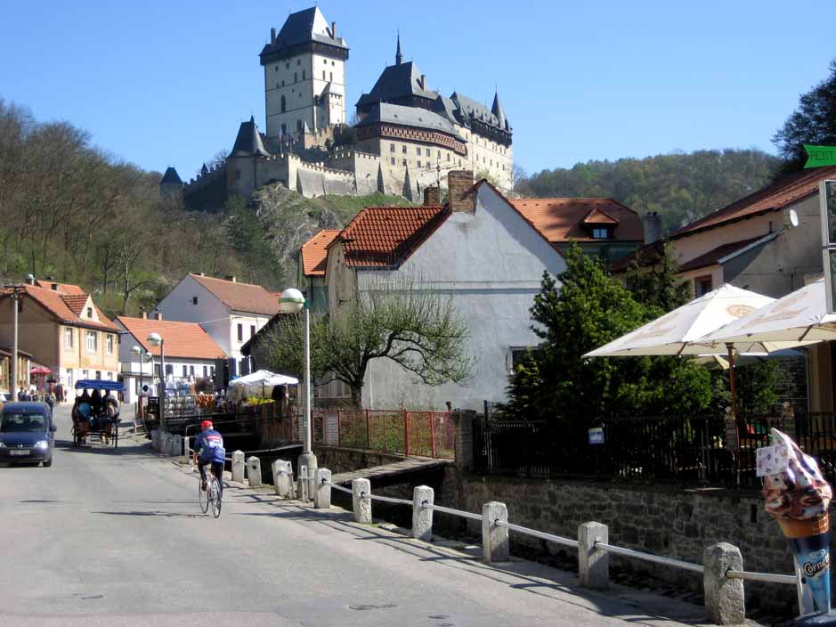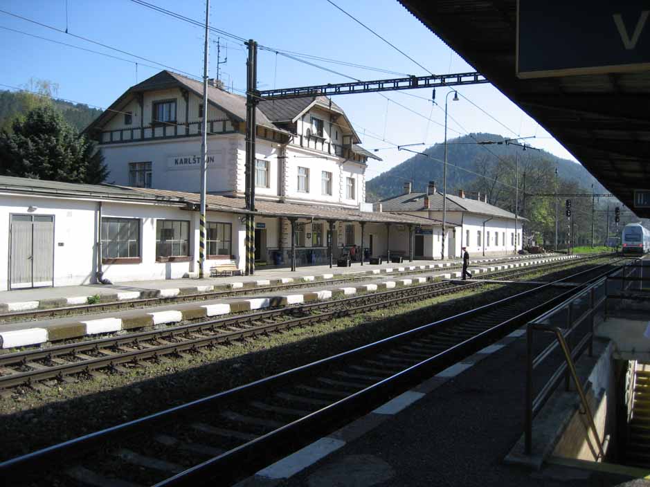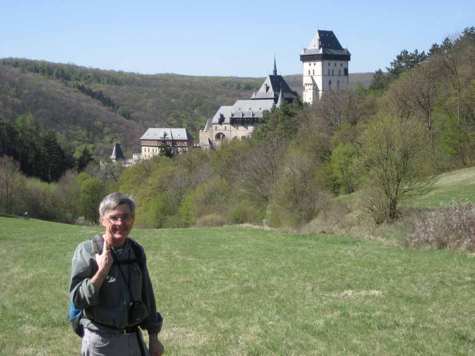 and KARLSTEJN CASTLE The little area of Karlstejn is situated in the Berounka Valley, surrounded by tall, rocky "hills" where the king made his retreat. The town is still tiny, one of the many dots on the railway line along the river. Czech is known for its hundreds of castles and this one, just south of Prague and an hour away from our home, is a mandatory stop for its natural location. Do you see the conductor walking across the tracks in the first picture. I gave the rail people heartfailure when I walked across it in Beroun because fast trains use the middle tracks and do not stop in smaller towns (and I had not seen the stairs to walk under the platforms -- now I know-- they nicely pointed it out to Lonnie before he did the same.)!! We followed the red & yellow trail signs out of town, both pointing in the same direction, and ended up on the wrong, but right trail for a photo of Lonnie with the castle in the distance. We followed a family on bicycles up the long hill while he gave a push to his little son. You can rent these sturdy mountain bikes at central railstations, carry it on the train, then get off and ride for the day on the many trails in the country, and return it in the evening. I cannot talk Lonnie into the bike route. "You don't have your hands free for photos and have to be watching the trail". We do enjoy the walking. The trails follow dirt roads along field sides, clearly marked on maps and seem to be public byways; they cross public roads but you generally don't have to walk on one unless it is through a small town. In the end we walked 4.5 hours to about 3 train stops away, along with the others out for the day. We expect to see many more castles in the coming days. Julie |