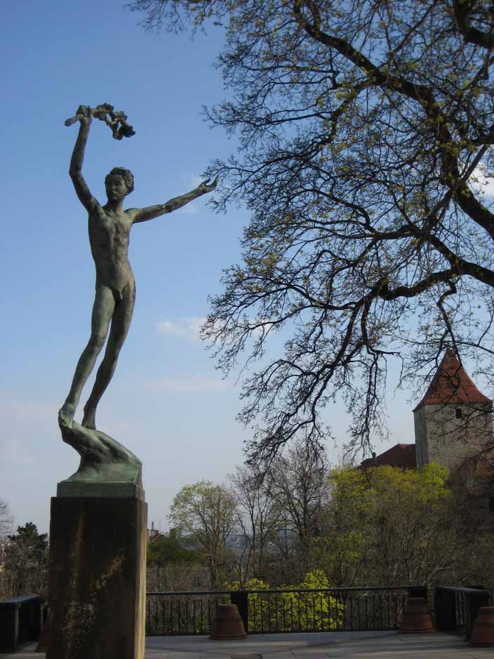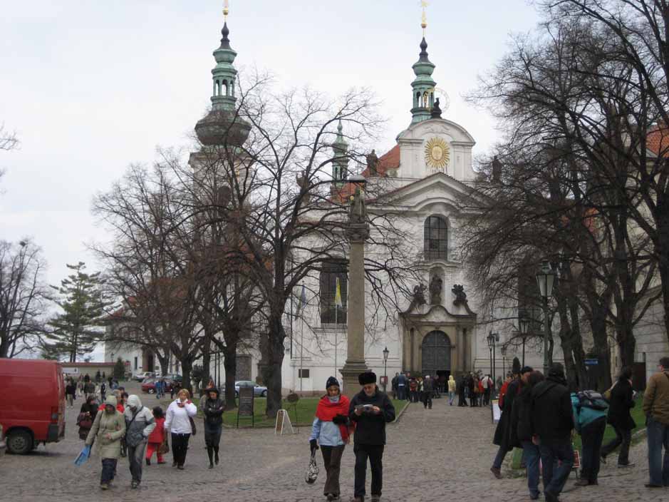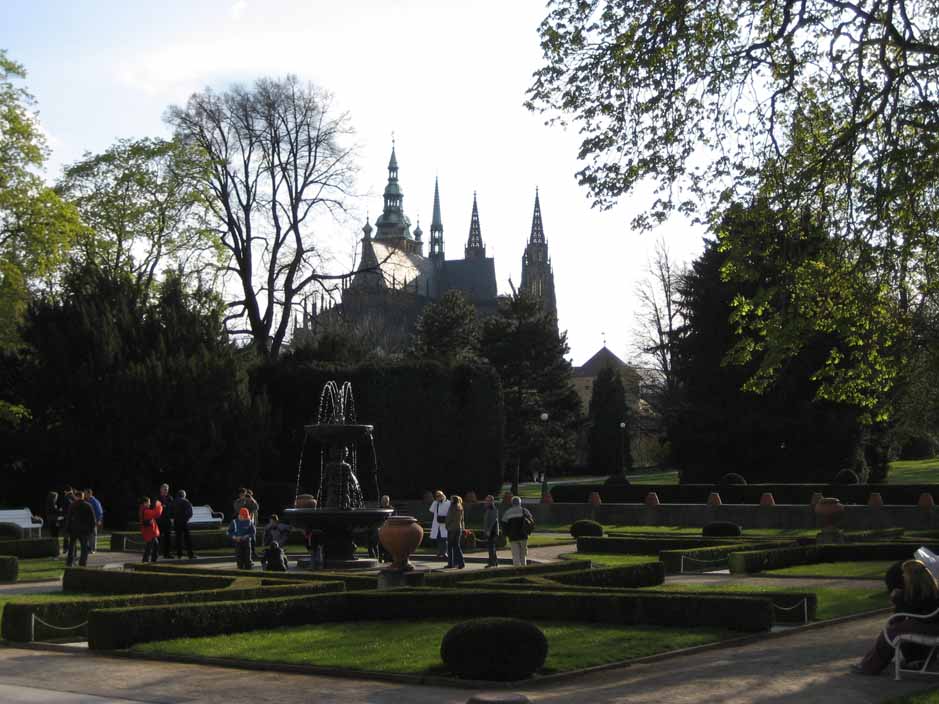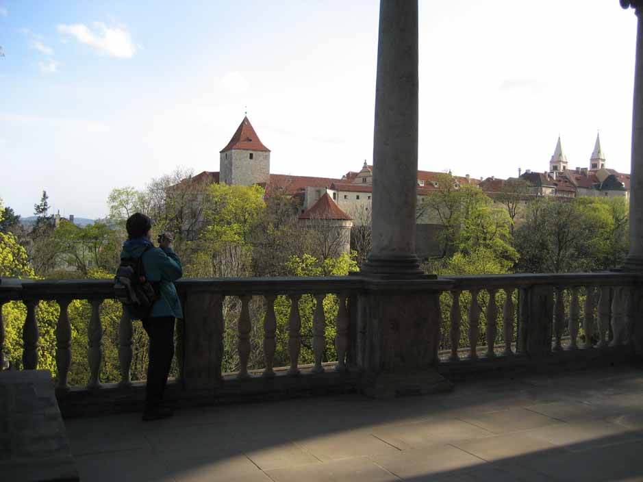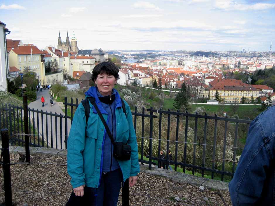 Easter Saturday Since most things are closed on Sundays and it would be Easter, and we thought everyone would be at church or with family, we decided to go to Prague on Easter Saturday. Were we wrong! Now we understand -- all of Europe is small, countries are close, anyone can run over to Prague for the holiday weekend, and EVERYONE DID. We decided to take an hour long bus to Prague and spend the day scoping it out, walking, no tours. It began with heavy gray skies, light rain and wind and ended with blue skies AFTER we had taken our castle pictures. Prague Castle looks like a huge church completely surrounded by very tall buildings for walls and towers to make it a "castle". All of the castle grounds and entrance to St. Vitus Church is free, so many come to just look around for the day as we did. For me the best part of Prague was walking across the St. Charles Bridge at sunset, seeing the old statues on the bridge, the water color painters, the boats on the river, and so many people strolling along like in old paintings. We will go back in June on a weekday and see it with blue skies and earlier in the day, but for now, this is our first Czech castle. |