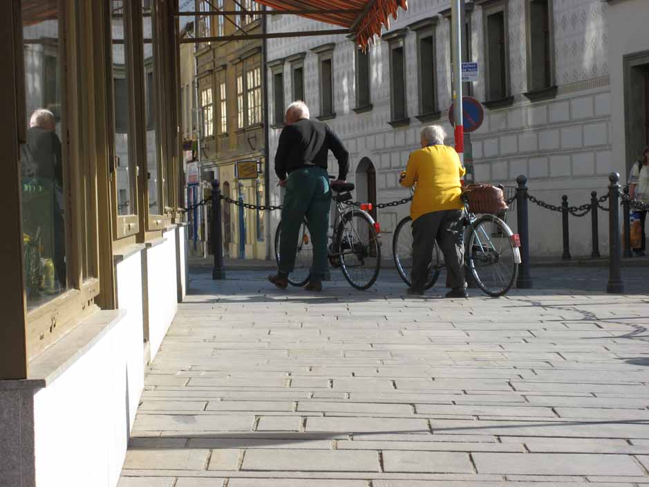 square The Plzen hl.n., short for main train station, has the best looking sweets and breads in town, so we started our Sunday there. The plan for the day was to visit a little water castle an hour south by train. We started by getting on the wrong train, facing the wrong direction, but the train had arrived at the correct time. A maintenance worker in bright orange came through to clear the train. With friendly smiles and hand signals and a smattering of German, we found that our rylich, fast train was "caput" somewhere between Prague and Plzen. Confirming this with a family, the German speaking 80ish senior was so concerned that we get the right train that he led me by hand back into the train information center and waitted while I got the scoop in English. Then he noted that "he would make sure we got on the right train and which station to get off" since they were heading the same way. Then we boarded another empty car, with others also boarding, and waitted for an engine to come hook up to us -- a very short train indeed. During the trip it was amusing to catch the kind senior's eye, watching for the ney and finally OK nod. People really want to help and folks older than 60 still speak fluent German, and my minimal knowledge of numbers and courtesies are helping. Svihov was originally built with an outside moat, and a complicated system to flood the inside 24 feet moat, now a grassy area, as well as a center area. It had an outside wall, an inside wall, and the buildings. One of the kings at the time decided that rebels could cause trouble and retreat to this well-fortified haven, so he had the whole eastern half of the walls torn down. From the available pictures it had been a veritable fortress. From there we took the train to the next stop Klatovy and enjoyed sunset dinner on the cobbled square. Everyone was clammering for ice cream and we saw an older couple walk their bikes through town, looked like locals. Wish I could get Lonnie on the bike. Still no pictures of Lonnie but now I am working on it. Note the new cover picture from yesterday's local walk. Julie |